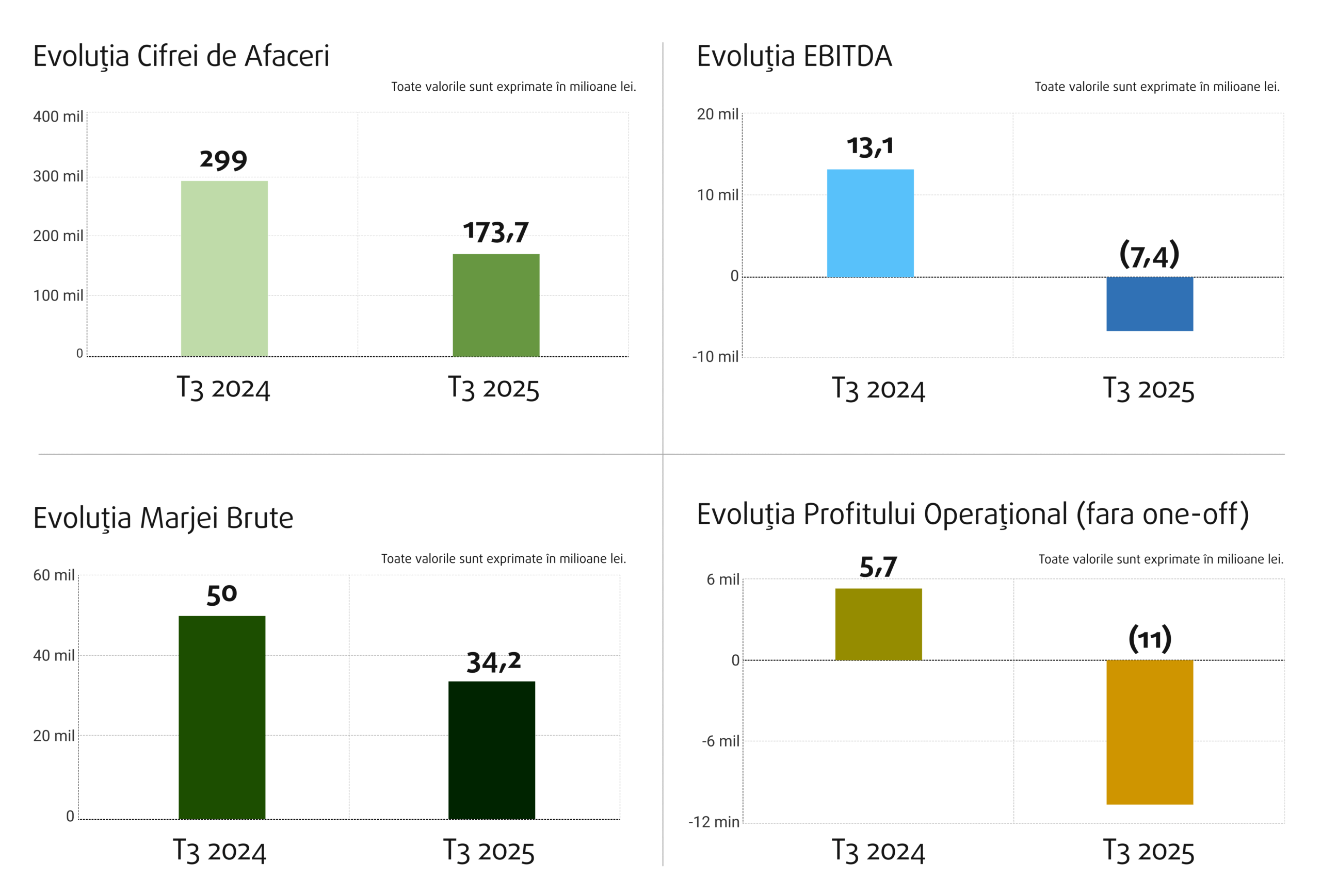 Rezultatul non-operațional (financiar) este o pierdere de -5,67 milioane lei, care include ajustarea mark-to-market a deținerii Bittnet în Softbinator aferentă T3. În acest context, rezultatul brut consolidat la nivel de grup, la 9 luni 2025, este negativ: -21 milioane lei.
